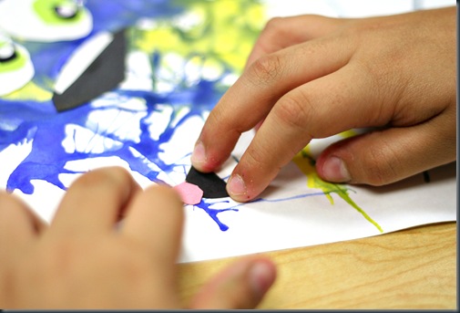 Then they used construction paper to make the face, and add details. I asked them to give their monsters personality. They were also told not to copy anyone, since they have a hard time with that sometimes. We still ended up with quite a few “artist” monsters!! I couldn’t say no to that!! Oh and of course I made sure that each student gave their monster an iris, pupil, and reflection of light in each eye!