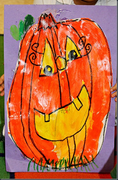 can you find my example? The kids drew the pumpkin with a black crayon, and painted the first day. Then outlined with black oil pastels, added leaves, cut out, and glued on the purple paper the next class… AND of COURSE, the varnish which only took five minutes with BIG brushes. They dried quickly and were able to take them home after the second class period.